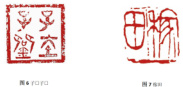 过分的强调雷同元素的变化,容易产生刻意,做作之嫌,而“残破”所呈现的虚实对比,在不矫揉造作的同时便可以对其做出巧妙且合理的变化,见(图6)子□子□,此印上方两个“子”中,体态上虽大致相同,因剥蚀程度的不同,出现了虚实的对比关系,使得左虚右实,最后一笔末端的“残破”同时也有效的使两字得以区别开来使得整方印既富有变化,又自然大方。(图7)稼田中由多条竖划、边栏、界格组成的印章中,对于多条长“竖划”的处理道理亦是如此。