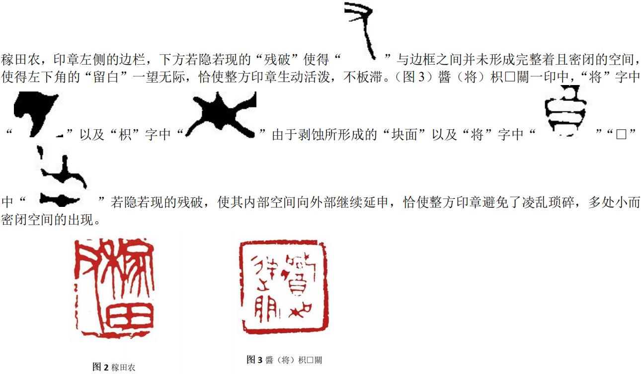 在篆刻创作中,吴昌硕曾云:“[刻印犹如造屋,在奏刀之前,必须做到全屋在胸,预先打好完整的图样。何处为厅堂,何处为侧屋,何处开门,何处启窗,应当一一作最恰当的部署,达到无可移易的境地。”][1]这里的“开门”与“启窗”无疑是对于空间的拆解与归纳,而“残破”恰恰可以体现这一创作诉求,给予印章一定的“透气性”或“密闭性”的感受,从而改变空间的分布,进而达到“疏可走马,密不容针”的效果,见(图2)