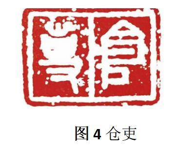 一件优秀的篆刻作品当中,各文字之间是紧紧联系着的,彼此之间相互参照成为一个和谐而又统一的整体,除去印文本身在其原有位置上与其他各文字以及边框之间所产生的联系外,“残破”也可使各文字之间乃至与边框之间的关系更加紧密,搭建一个彼此之间相互沟通的“桥梁”见(图 4)仓吏,可见呈“S”状的残破将本是带有界格户不干涉的两个字,拉近了彼此之间的距离,产生了一定联系,同时“吏”的上方以及“仓”的左侧与边框之间也产生了紧密的关系,使得“仓”“吏”以及边框三者之间彼此相容,成为一个完整的有机体。
