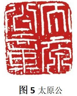 呆板,直白的印章是令人乏味的,如果将印章中文字所占有的部分比喻成“红花”的话,那么“残破”就可以充当为“绿叶”为其增光填色,衬托主体,活跃气氛见(图五)太原公章,此印由于“残破”的出现将本是四平八稳,多为横直的笔划增添了一份动态,零零散散的“残破”活跃在印章左下方,使得在视觉上不由自主的向印章的坐下角去牵引,给予了印章一种“跳跃感”活跃了气氛。