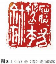 在篆刻创作中,文字之间乃至边框之间产生一定的关联是十分有必要的,但过分的联系,会使得整方印章略显刻意与呆板,“残破”可以有效的打破固有的秩序感,处于一种游离于“有意与无意之间”的一种创作状态,见(图 8)□(山)昜(陽)遂币師鉨中,“鉨”多条竖划,构建了横直排叠的一种秩序,与此同时,靠近最外侧的长竖划与右上方因“残破”所致的“零散”之处有效的打破了由多条竖划所形成的排叠,使得整方印章并不刻板。