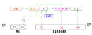 通过预设气体组分、液相物性,由传感器检测的温度 T、压力 P 计算出工况下密度 ρ 气,再由液体密度 ρ 液、气体工况密度 ρ 气与传感器检测的混合密度 ρ 混计算出 LVF 或 GVF,最后通过 LVF 或 GVF 与传感器检测的混合质量流量计 Q 混计算出气相流量 Q 气与液相流量 Q 液,流量可显示质量流量或体积流量。