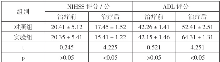 对比两组患者的神经功能缺损情况,依据尼亚特脑卒中(NIHSS)量表进行评估,评分越高,患者的神经功能缺损越为严重;日常活动活动(ADL)量表进行评估得分越高,患者的日常生活能力越佳。