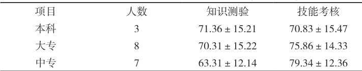 2.2 分析不同学历知识测试评分,本科和大专差异不大, p>0.05 ,中专和大专、本科相比,具备统计学意义, p<0.05 ,对比不同学历的技能考核评分,三组具备统计学意义, p<0.05