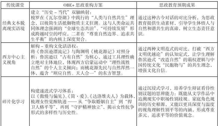 OBE 理念强调内容服务于成果达成,这为《英美文学》课程突破传统的“文学史 + 作品选读”模式提供了思路。首先,传统课程常按时间线或流派罗列作品,容易导致学生陷入碎片化知识的堆砌。而基于 OBE 理念,教师可根据预期成果重构内容框架,这种以成果为轴心的内容重组,让文学作品从孤立的文本转变为能力培养的载体,更贴合课程的育人本质。其次,在教学过程中,需以中国文化为根基,深入挖掘《英美文学》作品中的思政元素,并将其与教学内容有机融合。《英美文学》作品蕴含的思政元素主要包括人文精神、道德伦理、社会责任感及中西方价值互鉴等方面。例如: