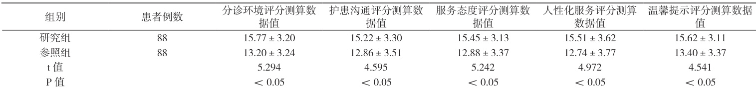 测算比照两组的护理满意度评分测算数据值(分诊环境评分测算数据值、护患沟通评分测算数据值、服务态度评分测算数据值、人性化服务评分测算数据值和温馨提示评分测算数据值)、分诊时间测算数据值、分诊等待时间测算数据值、挂号时间测算数据值、就诊总时间测算数据值,以及接受护理前后的SAS 评分测算数据值和SDS 评分测算数据值。