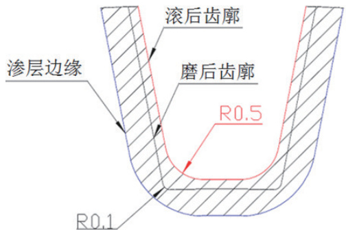 本文中的故障片齿轮,需进行碳氮共渗,在电子显微镜下对齿根圆角处渗层进行微观形貌观察,渗层分布均匀,但齿根圆角处渗层深度较其它部位偏小。片齿轮实际加工中先后经过滚齿和磨齿工序,滚齿刀具圆角尺寸为 R0.5,磨齿砂轮圆角尺寸为R0.1,导致齿根圆角处磨削量偏大,齿根圆角处渗层深度偏小,不满足图纸要求,如图 2。同时,由于磨齿砂轮圆角尺寸为 R0.1,导致齿根圆角不满足设计要求 R0.38⨀ 。