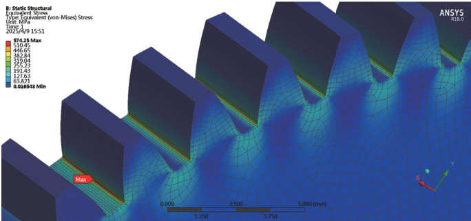 图3 齿根圆角为R0.1 时的应力分布