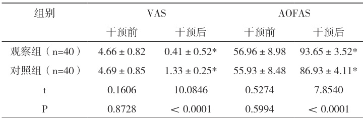 两组干预前VAS、AOFAS 评分对比,( P>0.05) 。两组干预后VAS 评分降低,AOFAS 评分升高,与同组干预前比较,( P<0.05 )。观察组干预后 VAS 评分低于对照组,AOFAS 评分高于对照组,( P<0.05 )。见表1 :