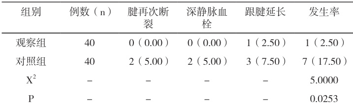 纳入 2024 年 1 月至 2024 年 12 月我院收治的跟腱断裂术患者 80 例,按照双盲法分为对照组与观察组,每组 40 例。对照组,年龄 23 岁至 42 岁,平均( 32.34±3.23 )岁。观察组,年龄 24 岁至 43 岁,平均( 32.89±3.45 )岁。两组资料比较,( P>0.05 )。