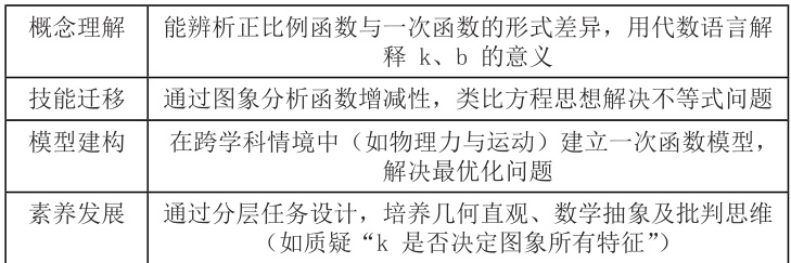 从理论基础来看,布鲁纳 [2] 的结构主义教育理论强调“学科基本结构”的重要性 . 他认为,学生掌握学科的基本结构,即掌握学科的基本概念、基本原理和基本方法,有助于构建起完整的认知框架,从而更深入地理解和掌握学科知识 . 在数学学科中,核心概念就是学科基本结构的重要体现,例如一次函数中的“变量关系”和“模型建构”等核心概念,学生掌握这些概念后,能够更好地理解一次函数的本质和应用. 威金斯 [3] 提出的“理解为先”教学设计理论则指出,通过大概念统整学习内容,能够促进高通路迁移,使学生在真实情境中灵活应用知识.