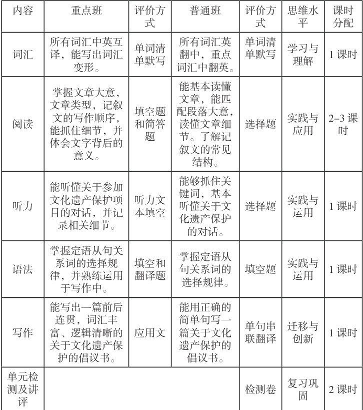 基于单元大概念,我们进一步区分出主题大概念与语言大概念,二者相辅相成,共同支撑单元目标的实现。主题大概念侧重于在“文化遗产保护”这一特定语境中,引导学生探究主题意义,培养文化意识、思维品质和价值判断能力;语言大概念则关注语言本体的学习,包括词汇、语法、语篇等知识的归纳、探究与迁移运用,以提升学生的语言运用能力和学习能力。在此基础上,可构建如下单元教学活动结构图,清晰展现大概念统领下的内容整合与活动安排: