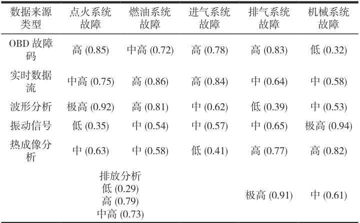 智能化诊断技术通过整合来自不同渠道的发动机运行参数,建立多维数据模型来提升故障诊断的全面性和可靠性。具体来讲,一是实施基于 D-S 证据理论的异构数据融合,将OBD 实时数据流、振动特征信号和热成像检测结果通过证据累积方法整合,消除单一数据源的局限性;二是构建层次化数据模型,按照传感器类型、故障关联度和信号可靠性设置权重系数,优先处理高置信度数据,如表 1 所示,不同数据源对各类故障的诊断贡献度存在显著差异。