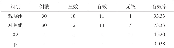 观察组治疗有效率更高,与对照组形成明显的数据差异( P<0.05 ),见表1。