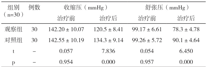 观察组患者管理后血压值均明显降低,与对照组形成明显的数据差异(P<0.05 ),见表2。
