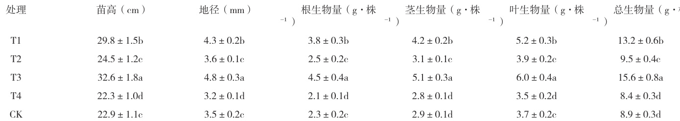 由表 1 可知,不同基质配方对云南松良种苗木生长指标影响显著( P<0.05 )。在苗高和地径方面,T3 处理表现最优,苗高达到 32.6cm ,地径为 4.8mm ,分别较 CK 高出 42.1% 和 38.2% ;其次为 T1 处理,苗高和地径分别为 29.8cm 和4.3mm ,显著高于 T2、T4 和 CK。在生物量积累方面,T3 处理的根生物量、茎生物量、叶生物量及总生物量均显著高于其他处理,总生物量达到 15.6g ·株⁻¹,较 CK 增加 58.6% ;T1 处理总生物量为 13.2g ·株⁻¹,位列第二。CK 处理的各项生长指标均为最低,表明单一园土基质不利于云南松良种苗木的生长。