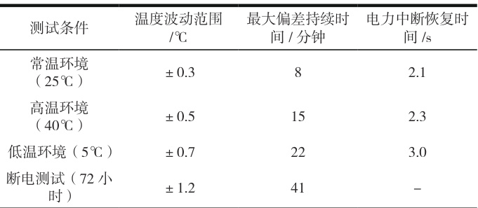 在实验测试中设置四组不同条件环境下进行数据对比。测试过程中对温度波动范围、最大偏差持续时间、电力中断恢复时间进行检测。通过在不同条件下的环境中多次测量对比,评估系统在实际环境中的检测效果,以验证系统设计的稳定性和可靠性[7]。表 1 所示为温控性能统计表。