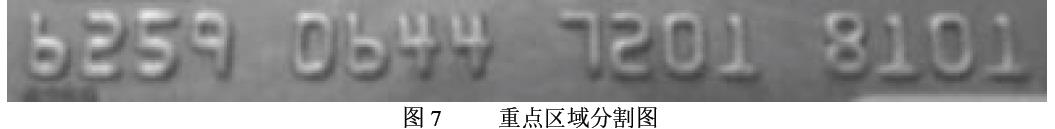 根据分析可知,银行卡的信息中包含有背景信息,因此需要根据数据分析,将背景等干扰项信息排除,得到只包含数字的四个区域。为了防止背景识别的情况 采用了循环遍历的方式进行了轮廓绘制,同时根据每个轮廓的宽高比进行过滤,允许信用卡从不相关换掉区域修剪数字,然后从左到右对分组进行排序,并使用阈值处理进行轮廓的查找和筛选。从而实现卡号的精准定位,重点区域分割如图 7 所示。