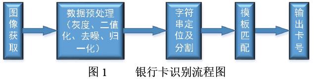 关于银行卡识别系统的设计,应该先对数据集进行获取,并对获取到的银行卡信息进行数据分析。确定出能够准确对银行卡信息进行定位的方法。并对数据进行分割,根据分割的数据与模板数据进行匹配。通过设置不同的阈值,提高分割的精度。最终在旋转、缩放和视角恒定的情况下,能够通过模板匹配技术对数据进行识别,识别流程如图1 所示。