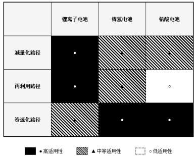 废弃电池循环利用路径按照 3R 原则可划分为减量化路径、再利用路径以及资源化路径三大类别,减量化路径通过电池设计优化、使用寿命延长来减少废弃电池产生量,包括模块化设计、快速充电技术以及电池健康状态监测等措施。再利用路径侧重于废弃电池的梯次利用,通过容量测试、性能评估以及重新组合等工艺,将退役动力电池应用于储能系统、备用电源以及低速电动车等领域,资源化路径聚焦于废弃电池中有价元素的深度回收,涵盖物理拆解、化学浸出、生物冶金以及高温熔炼等技术手段[2]。不同电池类型在循环利用路径选择上存在显著差异性,锂离子电池因其剩余容量相对较高更适合梯次利用,铅酸电池则更倾向于直接资源化处理(如图 1 所示),路径分类体系的建立为后续优化模型构建提供了基础框架。