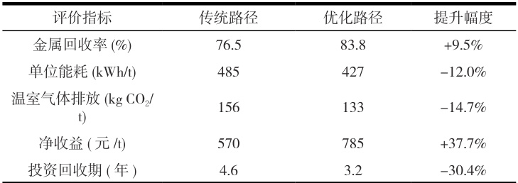 表 1 的对比分析表明,优化路径在关键指标上均表现出显著优势,金属回收率提升 9.5% ,单位能耗降低 12.0% ,温室气体排放减少 14.7% ,验证了优化路径的技术优越性和环境友好性。经济效益方面,净收益增长 37.7% ,投资回收期从 4.6 年缩短至 3.2 年,显示出良好的经济可行性。综合评价结果验证了基于循环经济导向的路径优化策略在提升废弃电池资源化利用综合效益方面的有效性。
