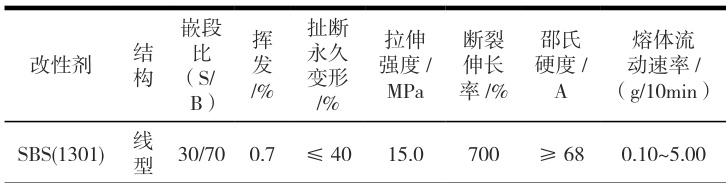 SBS 改性剂为甘肃省交通规划勘察设计院提供的线型 1301 型产品,该 SBS改性剂的具体技术指标参数如表2 所示。