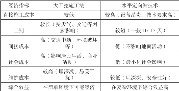首先,两种技术各有其适用场景和经济性。大开挖施工法直接成本低、技术简单、适应性强,在场地开阔、无障碍响小的区域仍具有经济性和实用性。水平定向钻技术初期投资高、技术要求严格,但在城市复杂环境下具有显著优势。其次,从综合效益来看,水平定向钻技术在工期控制(10-15 天)、环境影响(零开挖)、社会效益(不影响交通)和长期安全性(埋深深)方面具有明显优势,这些优势在城市建成道路环境中尤为宝贵。