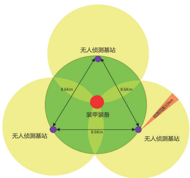 低空无人机侦测基站是一种能够对低空航道无人机实施严密监控的仪器,例如上海特金公司运用 TDOA(到达时间差定位技术)研制的基站式低空监测装置,其预警能力能够精准探测低空 600 米范围内的所有无人飞行器,有效覆盖 70MHz 至 6GHz 频段的无人机信道,实现 10km 范围内的无源探测,定位精度在 50m 内。如图 2 所示,可运用 3 个低空无人侦测基站,按照间距 8.6Km 的部署,实现以装甲装备位置为核心的 10 公里范围全域无缝覆盖,提前感知敌无人机来袭数量、位置和速度等情况,以便“中环”和“内环”的人员提前做好应对准备。