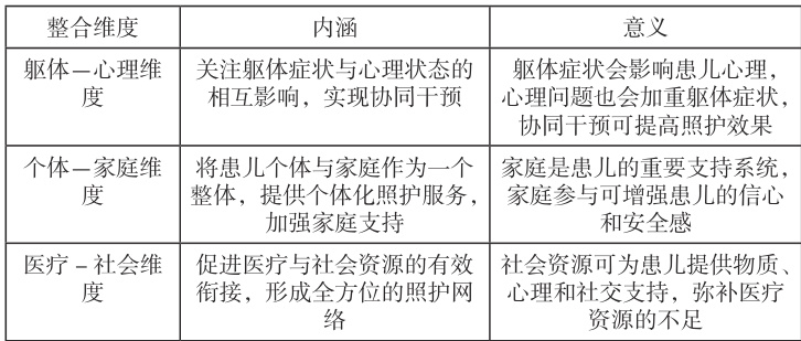 本研究构建的症状管理与精神照护多维整合模式,以患儿为中心,涵盖躯体-心理、个体-家庭、医疗-社会三个维度,实现症状管理与精神照护的有机融合。以下对各维度进行详细阐述: