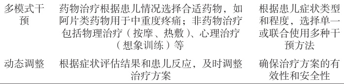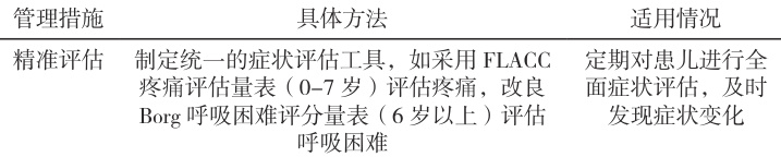 在症状管理方面,我们强调精准评估、多模式干预和动态调整。精准评估是症状管理的基础,只有准确知道患儿的症状情况,才能制定出有用的治疗方案。多模式干预就是把药物治疗和非药物治疗的好处都用上,为患儿提供更全面地缓解症状的办法。动态调整就是根据患儿症状的变化和治疗后的反应,及时调整治疗方案。具体内容如下: