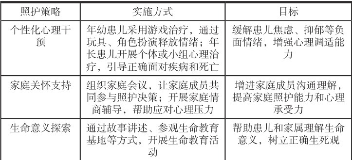 精神照护:针对患儿焦虑的情绪,给患儿做个体心理治疗,引导患儿说出心里的感受;组织家庭会议,让患儿的父母参与到照顾决策里,让家庭能给患儿更多支持;开展生命教育活动,给患儿讲一些励志的故事,帮助患儿理解生命的意义。慢慢地,患儿的心理状态变好了,能够积极面对疾病。