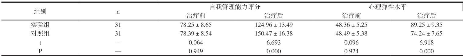 2.1 自我管理能力评分、心理弹性水平护理前组间 P>0.05 ,护理后,实验组的值均较高, P<0.05 ,见表1。