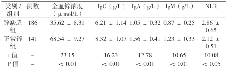 本研究观察指标包括全血锌浓度、IgG、IgA、 IgM 水平及 NLR 值,分别采用原子吸收分光光度法、免疫散射比浊法及血细胞计数系统检测,由我院检验科及儿科实验室统一操作并复核。