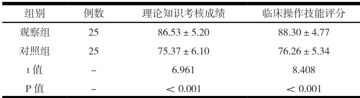 理论、实践操作评分均是观察组更高,与对照组比较差异显著( )。