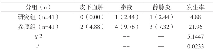 对比不同组别护理后的并发症发生情况,包括:皮下血肿、渗液和静脉炎。