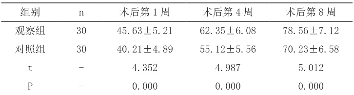 术后第 1 周、第 4 周、第 8 周,观察组 Lysholm 评分均高于对照组,差异有统计学意义( (P⟨0.05) ),详见表2。