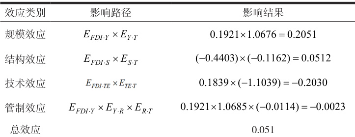 技术效应。综合算出 FDI 对碳排放量的技术效应系数为 0.2030,表明 FDI 的流入能够提升环境技术水平,进而降低碳排放量。前文假设 H3 成立。