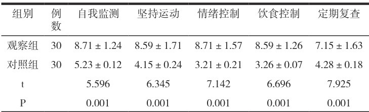 对患者依从性情况进行评估,指标为自我监测、坚持运动、情绪控制、饮食控制、定期复查等,单项评分0~10 分,评分提高后,患者依从性评分更高。