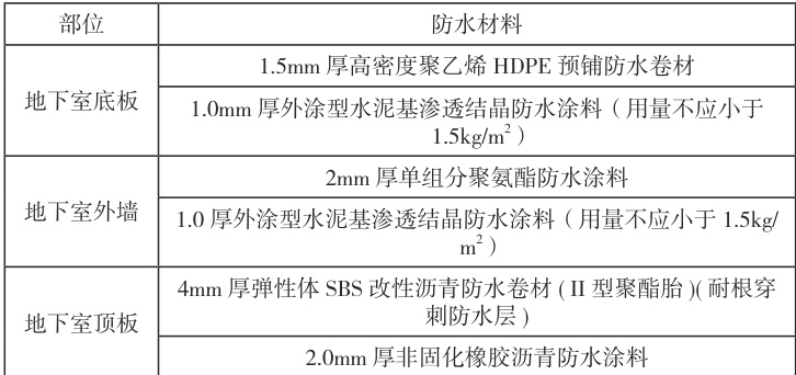 以某市高层住宅小区为例,占地面积约 34077.89m2,总建筑面积约 88515.29 ㎡,其中地上约 64293.55m2,地下约 24221.74m2,人防车库 6633.71m2。含 11 栋住宅楼及 4 个配套用房。地下一层,地上最高 17 层,由 1 栋 10 层住宅,建筑高度最高 54.75m。项目地处闹市区,周围环境相对复杂,西、南两侧为城市主干道,北侧为 2 层商业广场,东侧为支流,宽度约 10m,深度约 6m。洋房主楼筏板厚度550mm,高层主楼筏板厚度700mm,大地库范围筏板为400mm,外墙为300mm,顶板为250~350mm,防水等级P8。防水设计如表 1 所示: