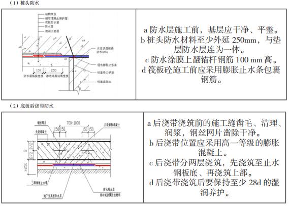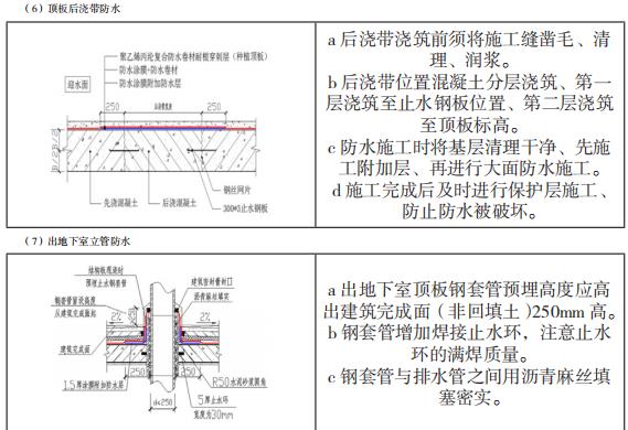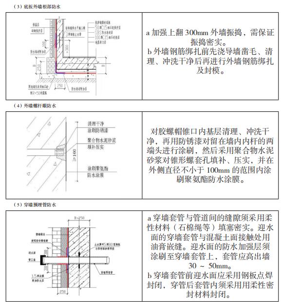 地下室易渗漏的部位主要为桩头、底板后浇带、底板外墙根部、外墙螺杆眼、穿墙预埋管、顶板后浇带以及出地下室立管,下面分别阐述各部位加强措施。