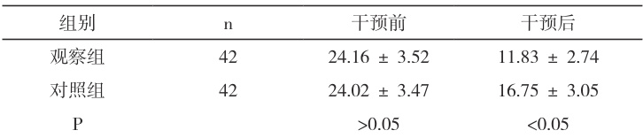 干预前两组 HAMA 评分差异无统计学意义( P>0.05 );干预后两组评分均下降,但观察组明显低于对照组( P<0.05 )。见表 1