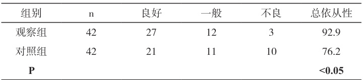 观察组依从性为 92.9% (39/42),对照组为 76.2% (32/42),差异有统计学意义( P<0.05 )。见表2。