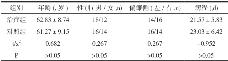 以我院 2020 年 1 月 -2022 年 12 月期间收治的 60 例脑卒中后偏瘫患者为研究对象。采用随机数字表法分为两组,每组30 例,两组基线资料均衡 (P>0.05) 。见表1。