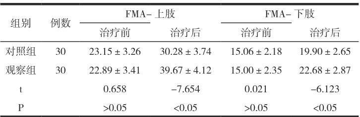 治疗前两组 FMA 上肢、下肢评分差异无统计学意义( P>0.05 );治疗后观察组各项指标均显著优于对照组( P<0.05 ),见表2。