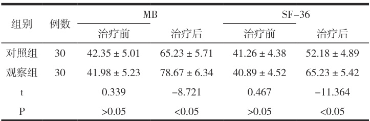 2.2 两组治疗前后 MBI 及 SF-36 总分比较治疗前两组 MBI、SF-36 总分差异无统计学意义( P>0.05 );治疗后观察组