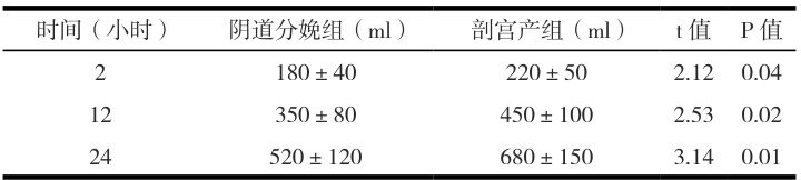 通过上表中的数据可知,阴道分娩组产产妇产后 2 小时、12 小时、24 小时的出血量均显著低于剖宫产组产妇( P<0.05 )。