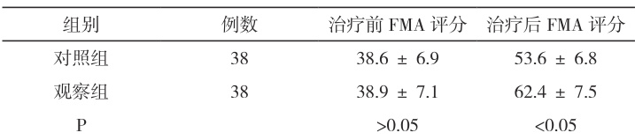 研究对象为本院康复科在 2023 年 8 月至 2025 年 6 月间收治的脑卒中后偏瘫患者 76 例,随机分为观察组与对照组,人数均为 38 例。纳入标准: ① 符合疾病确诊标准, ② 首次发病或既往无严重神经系统后遗症, ③ 发病 1 月内,存在肢体偏瘫, ④ 意识清楚,能配合治疗。排除标准: ① 脑出血吸收不良或占位性病变, ② 合并严重心肝肾功能障碍者, ③ 精神障碍或严重认知障碍者。