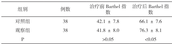 对照组包含男性21 例、女性17 例,年龄 45~76 岁,平均年龄为( 61.3±8.1 )岁,偏瘫类型:左侧21 例、右侧17 例。观察组由男性22 例和女性16 例组成,年龄范围 43~75 岁,平均( 60.7±7.9 )岁,其中左侧偏瘫20 例、右侧18 例。两组在基本情况比较中差异不具有统计学意义( P>0.05 ),研究具有可比性。1.2方法