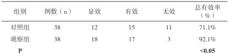 本研究发现,观察组总有效率为 92.1% ,对照组仅为 71.1% ,组间差异显著( P<0.05 )。见表