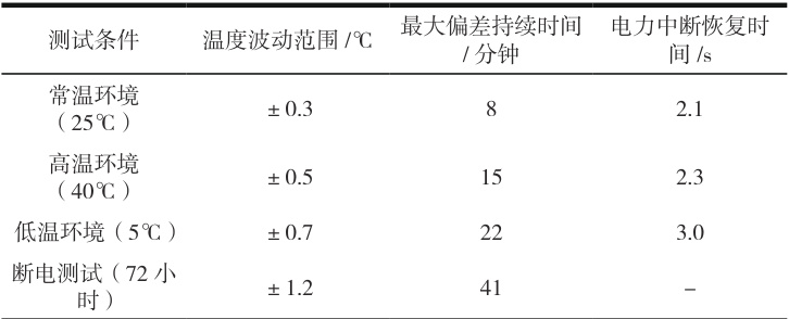 在实验测试中设置四组不同条件环境下进行数据对比。测试过程中对温度波动范围、最大偏差持续时间、电力中断恢复时间进行检测。通过在不同条件下的环境中多次测量对比,评估系统在实际环境中的检测效果,以验证系统设计的稳定性和可靠性[7]。表…1 所示为温控性能统计表。